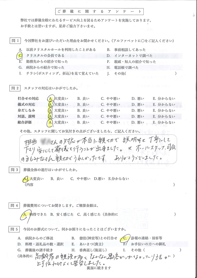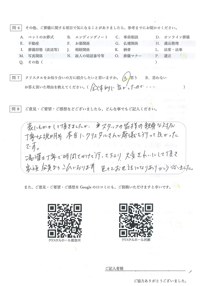 クリスタルホール 能登川では、葬儀を終えられたご家族の方にアンケートにご協力いただき、より良いサービスの提供に努めております。